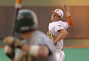 The Bears broke on top 3-0 in the top of the third as they loaded the bases with two outs before Zach Dillon and Reid Brees came up with consecutive singles to bring home three runs. Baylor starter Cory VanAllen, meanwhile, limited the Longhorns' offense to a pair of base hits through the first five innings. On the other side of the ledger, UT starter Randy Boone (Yoakum, Texas) retired eight in a row after Baylor scored its third run to keep the Baylor lead at 3-0.