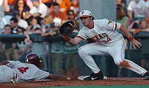 The game settled into a pitcher's duel from the outset as McCulloch for Texas and Daniel McCutchen for Oklahoma managed to limit the two offenses to a combined four singles over the first four innings. In the fifth, both UT and OU placed a runner on third with two outs, but again McCulloch and McCutchen kept the game scoreless by inducing a foul flyout and a groundball, respectively. While both teams again threatened as the Horns received a leadoff triple from Nick Peoples (Round Rock, Texas) to open the sixth and the Sooners came up with back-to-back singles with two outs in the bottom of the frame, McCutchen struck out the side and McCulloch retired his next batter on a fly ball to move the game to the seventh tied at 0-0.