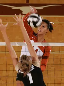 AUSTIN, Texas -- The Texas middle blockers didn't need to do much blocking on Wednesday night considering the way they were swinging away for kills against Colorado. Leticia Armstrong and Brandy Magee combined for 42 of UT's 66 kills as the 18th-ranked Longhorns defeated the Buffaloes - 30-16, 27-30, 30-22, 30-19 - in the teams' first Big 12 Conference match of the season in front of 1,570 fans at Gregory Gym.