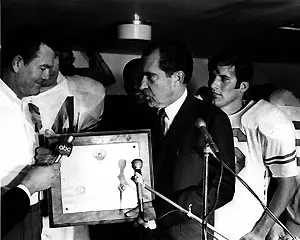 The day of the game took an on an eerie feeling. The night before, a steady, cold rain fell in Fayetteville and an icy fog hovered over the stadium as the crowd awaited the arrival of President Richard Nixon, who would award a plaque symbolic of the National Championship to the winner.