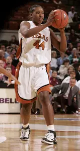 The Cowgirls would miss four shots and commit two turnovers down the stretch, scoring just two free throws in the final 2:28. Oklahoma State cut the lead to one with 19 seconds to go, 57-56, on two Smith foul shots before Jackson, fouled on the next play, sank both ends of a one-and-one for a 59-56 Texas edge. On OSU's next possession, Jackson stole the ball at midcourt with sevens ticks left on the clock. UT's Nina Norman was fouled and Norman hit both free throws for the final 61-56 edge.