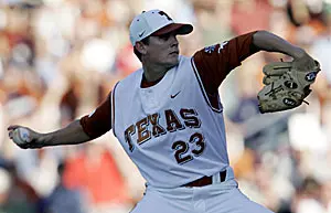 After UT had posted a hit in each of the first four frames and were kept off scoreless by Aggies starter Jason Meyer, Texas A&M used three doubles in the bottom of the fourth to score twice and then a passed ball on a strikeout that combined with a throwing error to pull in front 3-0. Looking to answer immediately in the top of the fifth, the Horns put runners on second and third with one out via a leadoff single from Kyle Russell (Tomball, Texas), an error on a fielder's choice bunt and a sacrifice. Although Meyer would get his next batter to hit a come-backer to the mound that resulted in an out at the plate, Drew Stubbs (Atlanta, Texas) followed with his 11th round-tripper of the season to knot the game at 3-3. One inning later in the sixth, Russell came up with a one-out single, stole second and scored on a two-out, RBI-double off the bat of Nick Peoples (Round Rock, Texas) to give Texas a 4-3 advantage.