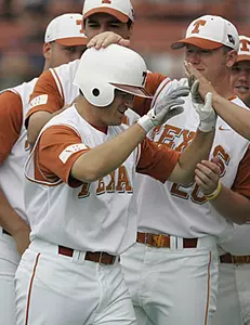 One inning later in the fourth, the Horns put runners on second and third with two down after a leadoff walk, a bunt base hit and a sacrifice. An error on a failed pickoff attempt then scored one run before a walk was followed by a safety squeeze bunt from Fuller to bring in another score to make it a 3-1 game. Still at bat, the Horns received three RBI-singles and a walk with two outs that combined with an outfield throwing error to bring in three more runs and build a 6-1 UT advantage. While the Patriots loaded the bases in the top of the fifth with two outs, reliever Kyle Walker (The Woodlands, Texas) struck out his next batter to keep the lead in tact. UT then loaded the bases with one out in the sixth on a hit batter and two walks before a two-run single from Kainer and a two-out, two-run home run from Harris to stake the Horns to a 10-1 lead.