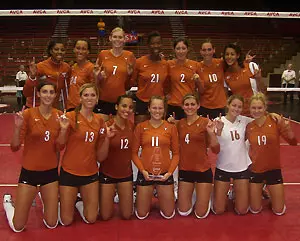 MADISON, Wis. -- University of Texas freshman Destinee Hooker (San Antonio, Texas) swung for a match-leading 22 kills Saturday evening, and none were more important than her last four. Hooker landed kills on the final four points of the match to erase a 13-11 fifth-game deficit, as No. 8 Texas (2-0) upended No. 3 Washington (1-1), the defending NCAA Champion, by a 3-2 count (30-24, 23-30, 30-27, 28-30, 15-13) in the finals of the AVCA Volleyball Showcase at the UW Field House. Senior Dariam Acevedo (Trujillo Alto, Puerto Rico) added 19 kills and 11 digs, while junior Leticia Armstrong (Elkhart, Ind.) contributed 15 kills for the Longhorns. UT junior Michelle Moriarty (Houston, Texas) notched a game-high 64 assists and was selected as the AVCA Volleyball Showcase Tournament MVP. Christal Morrison led the Huskies with 22 kills on .353 hitting, and Courtney Thompson chipped in 61 assists and 22 digs.