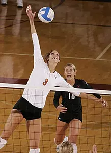The Horns had four players finish with double figure kill totals, with Paolini leading the way with 13 kills on .550 hitting and Engle and Acevedo finishing with 11 kills apiece. Acevedo has now posted 10 kills or more in each of Texas' nine contests. Hooker joined in with 10 kills and a .625 attack mark, while junior setter Michelle Moriarty dished out 43 assists and tallied nine digs for the match.
