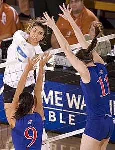 Senior setter Michelle Moriarty steadied the Texas attack on the night with 51 assists and six digs, while senior libero Alyson Jennings highlighted the defense with a match-high 16 digs. Paolini collected nine kills and posted a .444 attack mark in the win and the Longhorns out-hit the Jayhawks .388-to.081.