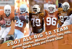 Junior RB Jamaal Charles, senior S Marcus Griffin and senior OT Tony Hills earned first-team honors, while senior DTs Derek Lokey and Frank Okam were named to the second team.