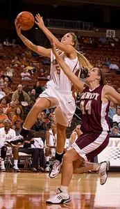 The Longhorns closed the first half with a 15-3 run over the last 4:14, with Williams netting seven of those points on a three-pointer, two free throws and a short jumper. Prior to that run, the Longhorns trailed 27-26 following a backdoor layup by DePaul's Erin Carney.