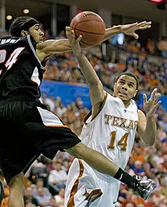 Oklahoma State point guard Byron Eaton threw the ball away on the Cowboys' subsequent possession, and A.J. Abrams and Damion James combined to go 5-of-6 from the free-throw line in the final 26.1 seconds to seal the win for Texas.