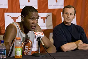 On having Kevin for one season: I don't think there is a risk recruiting; believe me we would like to have a Kevin Durant every year. I don't think that is a risk. That is the reality of college basketball today. The one thing I have always said is we would never recruit someone that we knew was thinking about one year in college. At this time of year, Kevin could walk away today and not go to class again, but that is not what he is about. We knew really quickly in the recruiting process that there was a standard of not only what he expected, but also what his mom and dad expected. Those who have been around him his whole life knew he was going to go to college and not just be a basketball player. I can sit here and talk about his basketball but we are probably more impressed with the way he has attacked it academically and the way he has gone after that. I think the country got to see him grow up on the basketball court, but as he says, we have watched him grow each and every day to mature into a guy that is ready to take it to the next level. This is going to be a challenge. I don't know of anyone who goes into their future that doesn't struggle a little bit. But, I think he is equipped. I think he has the things that he needs to press forward.