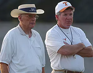 But nowhere is his personal involvement more apparent than it is with University of Texas football. He goes to all the home games and most of the away games. He faithfully attends all the football practices as well, which once prompted Coach Mack Brown to say, "He's made more practices than I have."
