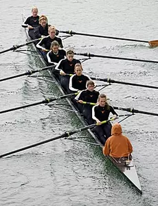 Some people worry that they are not fit enough to try out for rowing. Fitness does figure into selection for the team, but qualities like dedication, focus, and enthusiasm are also important selection criteria. If you have the potential and dedication, we will work with you to improve your base fitness level. We also need people to serve as coxswains in the boat. The coxswain steers the boat, commands and motivates the rowers. Again, we teach you how to do all of these things. The coxswain will become a feisty competitor if she isn't one already!