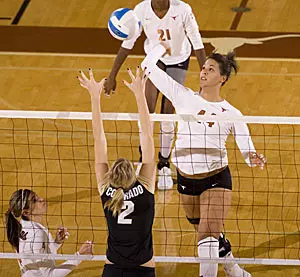 Freshman outside hitter Juliann Faucette hammered out a match-high 18 kills to help Texas (8-3, 4-1 Big 12) out-hit Colorado (5-8, 0-5 Big 12) .400-to-.211. Sophomore outside hitter Destinee Hooker added 17 kills, while junior middle blocker Lauren Paolini added 11 kills and senior middle blocker Brandy Magee registered 10 kills on .833 hitting.