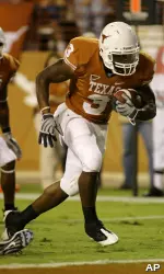 With baseball stars Derek Jeter and Roger Clemens on the sideline to watch the rout, McCoy scored Texas' first touchdown on a 6-yard run. His first TD pass was a 32-yard strike to Malcolm Williams, who jumped over the double-coverage of safeties Justin Garrett and Williams for the grab.