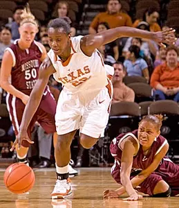 After a short jumper by KU's Sade Morris, Texas got an unlucky break seconds later when starting junior post Ashley Lindsey was whistled for her fourth foul with 9:23 to play. That sent Krysten Boogaard to the line where she hit both free throws to extend KU's lead to five (40-35).