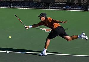 Texas scored the doubles point with wins at the second and third positions. Sophomores Dimitar Kutrovsky and Josh Zavala opened with an 8-4 win at the third slot over Reid Carleton and Alain Michel, and senior Luis Diaz Barriga and junior Miguel Reyes Varela nailed down the point with a decisive 8-3 win at second doubles over Dylan Arnould and Alex Stone.