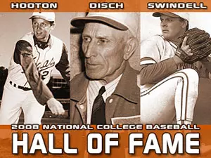 AUSTIN, Texas -- Three former Texas Longhorns were among the 12 players and coaches comprising the 2008 National College Baseball Hall of Fame Induction Class, the College Baseball Foundation announced on Wednesday. The late Billy Disch, a former UT coach, and former Horns' hurlers Burt Hooton and Greg Swindell are slated to join the prestigious group.