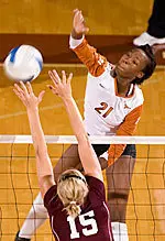 In the second, a 6-1 Texas A&M run gave the Aggies a quick 11-6 edge. Texas responded immediately with a 5-0 run paced by a kill and an ace from Hooker that evened the tally at 11. The Horns kept their rally going with a 5-0 run capped by a solo block from junior middle blocker Jennifer Doris that put UT ahead, 17-13. A kill by freshman middle blocker Sha'Dare McNeal widened the margin to 22-17 and an A&M attack error allowed Texas to close out the frame, 25-20.