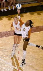 In the second, Texas overcame an early deficit and went on a 14-3 run headlined by four kills and a solo block from Hooker that extended the UT lead to 19-9. A block and a kill on consecutive points by Webster pushed the tally to 22-11 before a kill by junior middle blocker Jennifer Doris and back-to-back kills from Adams closed out the stanza 25-14.