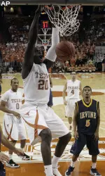 UC-Irvine had no way to match up with the 6-foot-10, 290-pound Pittman, who scored at will on 10-of-11 shooting. Pittman scored Texas' first two baskets after halftime and his dunk off a steal by Justin Mason put the Longhorns up 57-29.