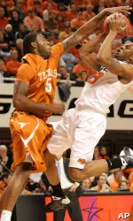 After allowing Abrams to get open and hit his first 3-point attempt, the Cowboys locked in on him with a defense that sagged off the Longhorns' other perimeter players to keep Pittman and James from doing any damage inside. The lead swelled as far as 38-21 when Terrel Harris followed Anderson's two-handed jam with a pair of free throws with 17:08 to play.