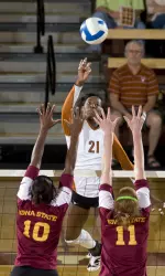 In the first set, Texas leapt out to a commanding 5-0 lead to start the frame, taking advantage of two quick kills by senior All-America setter Ashley Engle. The Longhorns pushed the lead to as many as six, but the Cyclones battled back to close the margin to 17-15 on a kill by senior setter Kaylee Manns. ISU tied the set at 22 before a kill by senior All-America outside hitter Destinee Hooker and two Cyclone miscues lifted UT to a 25-22 win.