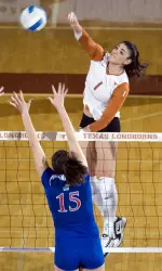 The Longhorns fell behind quickly in the third as the Jayhawks jumped out to a 6-1 lead and widened the margin to 11-5 on a double-block by Nicole Tate and Caroline Jarmoc. Texas battled back with a 4-1 run to pull within one at the 17-16 mark and two kills by Faucette pushed the Horns ahead, 21-20. The Jayhawks and Horns traded the next five points before KU forced set point 24-23. Texas evened the set at 24 before two kills by Kansas' Karina Garlington lifted KU to a 26-24 set win.