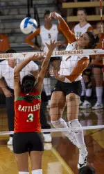 Faucette headlined the Horns' attack just missing her career-best kill total by one and adding three service aces, nine digs and three blocks. Junior middle blocker Rachael Adam was stellar as well, totaling 13 kills on .500 hitting, while freshman outside hitter Ashley Bannister connected for nine kills and posted a .412 attack mark.