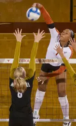 AUSTIN, Texas - Freshman middle blocker Khat Bell hammered out 11 kills and hit a career-best .917 as the 10th-ranked Texas Volleyball team swept past Missouri, Saturday night at Gregory Gymnasium. The 25-17, 25-19, 25-14 victory extended the Longhorns current winning streak to six matches and improved their home winning streak to 24 matches. The win moved Texas to 14-4 on the season and 7-1 in Big 12 play, while the Tigers fell to 17-8 overall and 3-5 in league action.