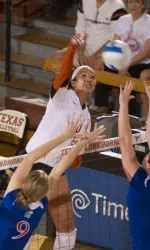 In the third, Texas used two kills and a block by Bell to fuel a 7-1 run in the early going and grab an 11-4 lead. The Sooners rallied to close the gap to 17-13 before the Horns responded with a 5-1 run to push the lead to six and ultimately close out the frame, 25-17 on Eckerman's fourth kill of the set.